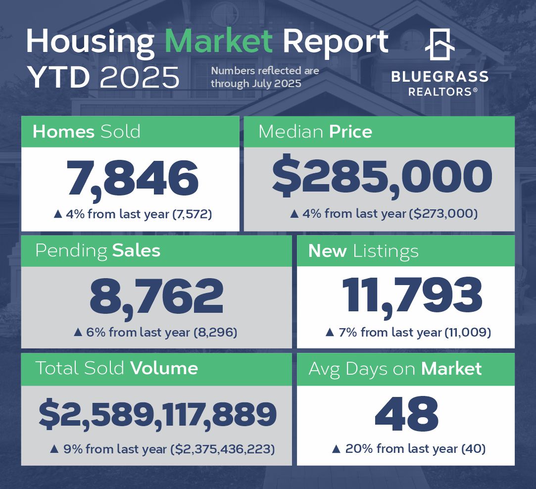 The housing market across Central and Southern Kentucky delivered strong results in July 2025, with most major categories seeing improvement compared to last year, according to the latest report from Bluegrass Realtors®.